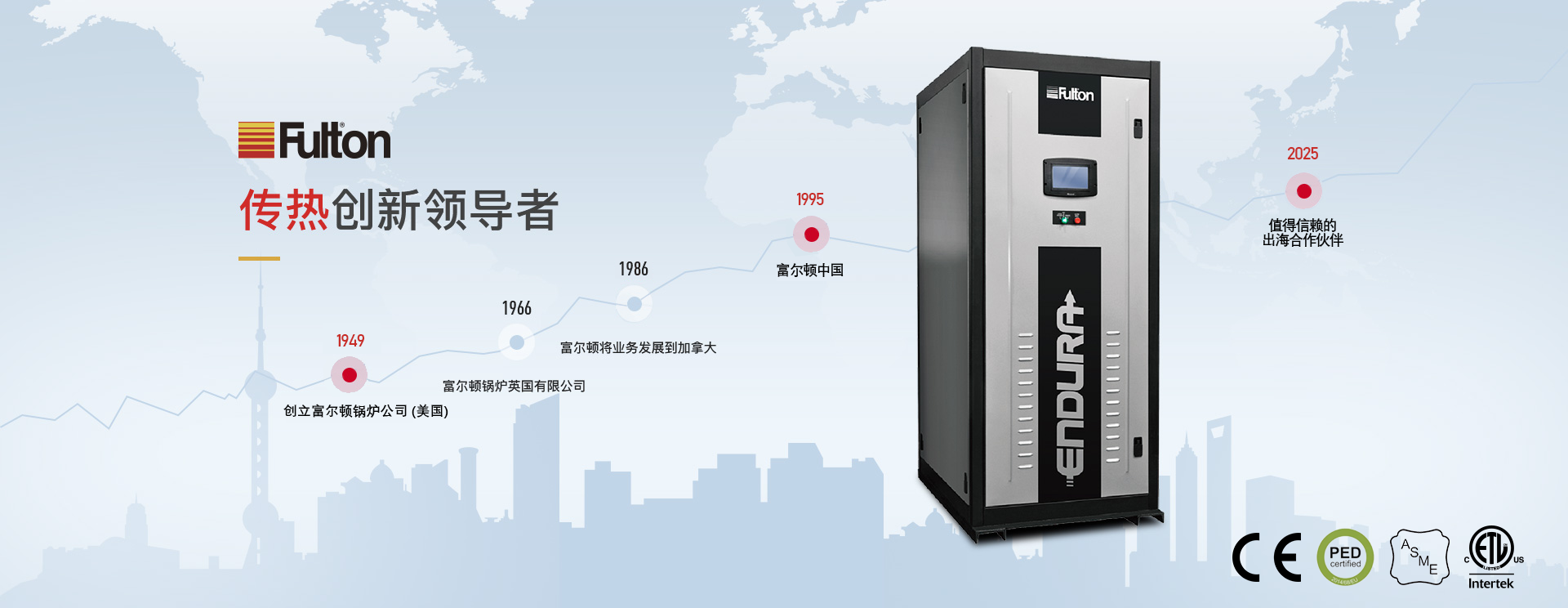 富爾頓是國(guó)際著名的跨國(guó)高質(zhì)量傳熱產(chǎn)品制造商,具有七十多年的專(zhuān)業(yè)設(shè)計(jì)、制造、銷(xiāo)售鍋爐的經(jīng)驗(yàn),是立式無(wú)管鍋爐和脈沖燃燒鍋爐的發(fā)明者,幾十年來(lái)一直領(lǐng)導(dǎo)世界鍋爐新潮流。